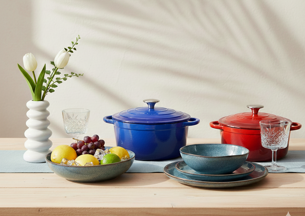 Desde la cocción perfecta hasta el brindis final. Descubre nuestra colección integral de menaje: la robustez del hierro fundido, la elegancia de nuestra cristalería y los accesorios precisos para cada receta.