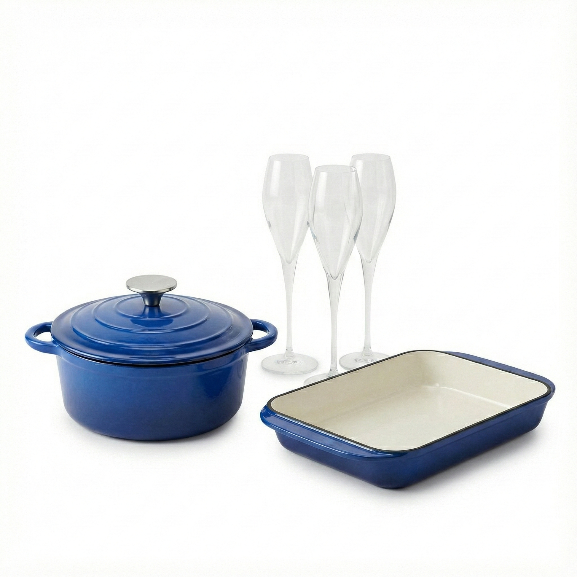 Este set combina la versatilidad de nuestro Hierro Fundido Esmaltado (perfecto para que tu cena se mantenga caliente durante toda la velada) con la elegancia festiva de nuestras copas Monte Carlo, diseñadas específicamente para realzar las burbujas de tu espumante favorito. Prepara tus mejores recetas y alza tu copa con distinción.